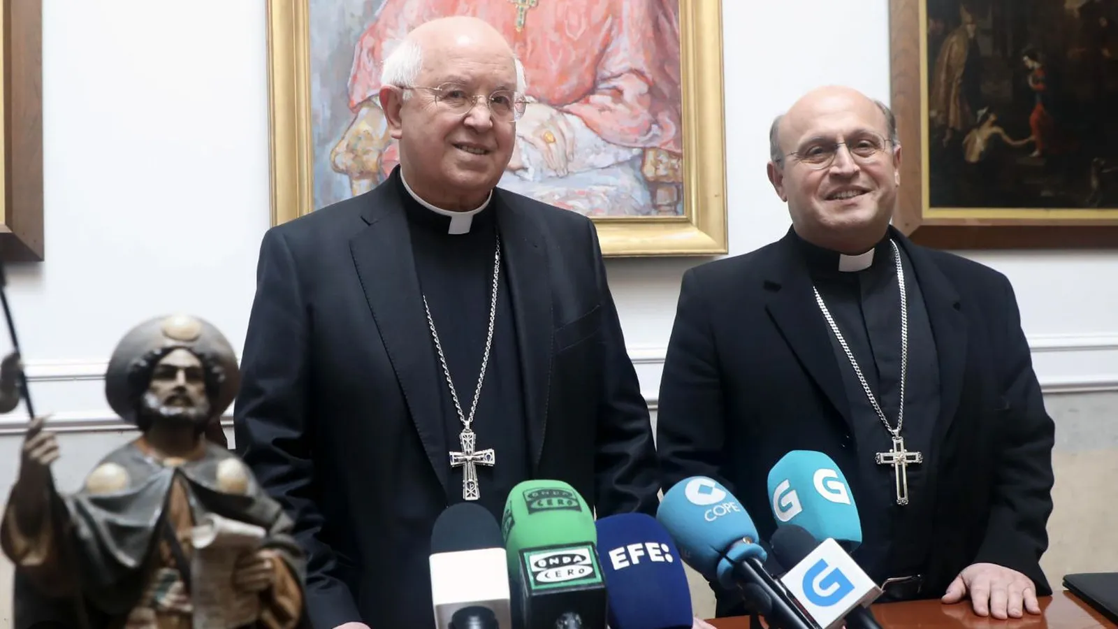 Desde el fondo de la sala de la rueda de prensa, se veían las dos cabezas, grandes, de los dos arzobispos, y sus no menos imponentes calvas, limpias de hierbas o pelambres capilares en la pista principal o de despegue. Colgado en una pared se veía el retrato de otro orensano, el cardenal Quiroga Palacios, de mucha importancia, pues fue el primer Presidente de la Conferencia Episcopal española, el organizador del Centro Ferroviario de la Acción Católica y hasta fue “Medalla al Mérito Turístico”.