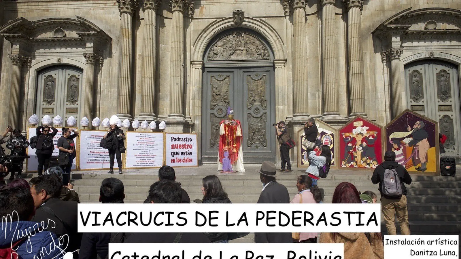El reclamo se hizo junto a una exhibición artística con pinturas, inscripciones y una escultura en puertas de la Catedral Metropolitana de La Paz, que fue acompañada por algunos allegados a las víctimas de los abusos.
