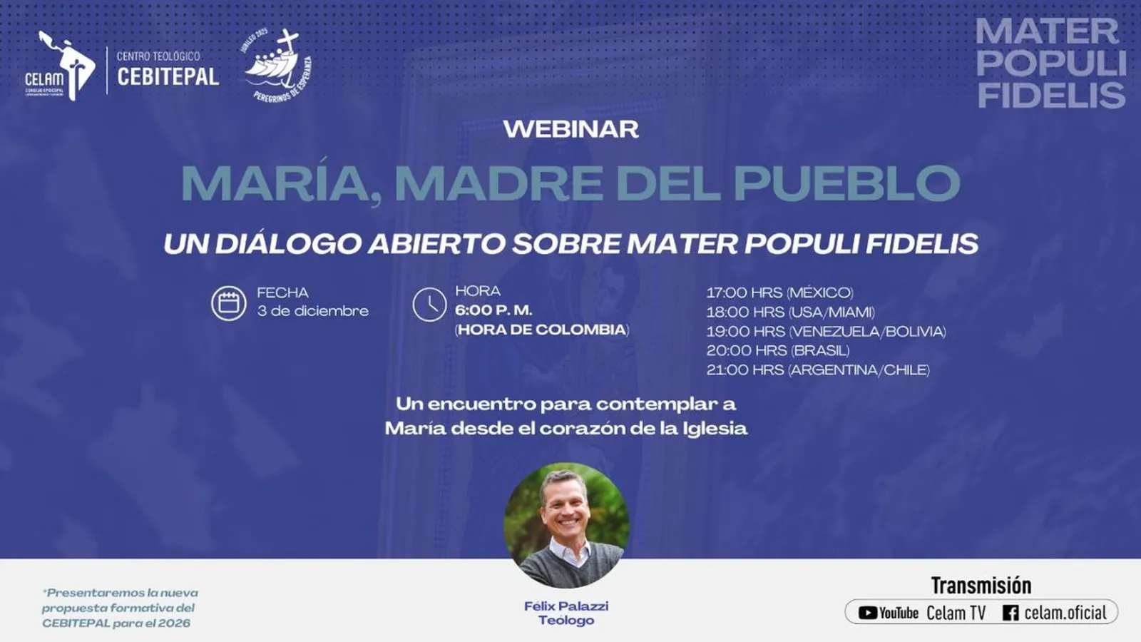 El Consejo Episcopal Latinoamericano y Caribeño (Celam) invita a toda la comunidad eclesial del continente al Webinar “María, Madre del Pueblo”, un encuentro formativo y espiritual para reflexionar sobre la reciente Nota doctrinal Mater Populi Fidelis, publicada por el Dicasterio para la Doctrina de la Fe. La cita será el 3 de diciembre, con transmisión en vivo a través de YouTube – Celam TV.