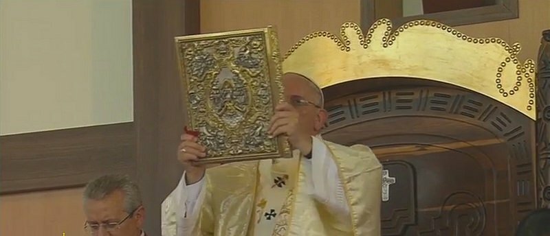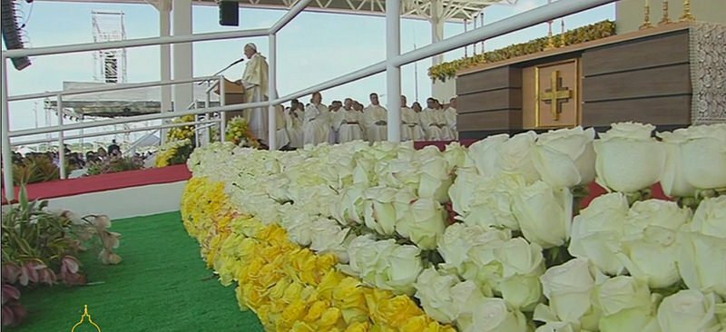 El altar, coronado por una cruz con los colores blanco y amadillo del Vaticano. Elegante, pero recargado, al estilo ecuatoriano y al estilo litúrgico del arzobispo de lugar, monseñor Arregui, del Opus Dei. Incluso la casulla papal bordada en oro. Y la sede, un tanto fastuosa, con partes dorados.