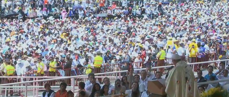 (José M. Vidal).- Misa de multitudes del Papa en Guayaquil, la "perla del Pacífico", en la inmensidad del Parque Samanes, que acoge a unas 600.000 personas. El Papa Francisco, ante esta marea humana, ensalza a María, intercesora ante el Hijo en las bodas de Caná. Y lanza un canto a la familia, que es "una gran riqueza social", la primera escuela, el primer hospital y la primera iglesia, donde "la fe se mezcla con la leche materna".