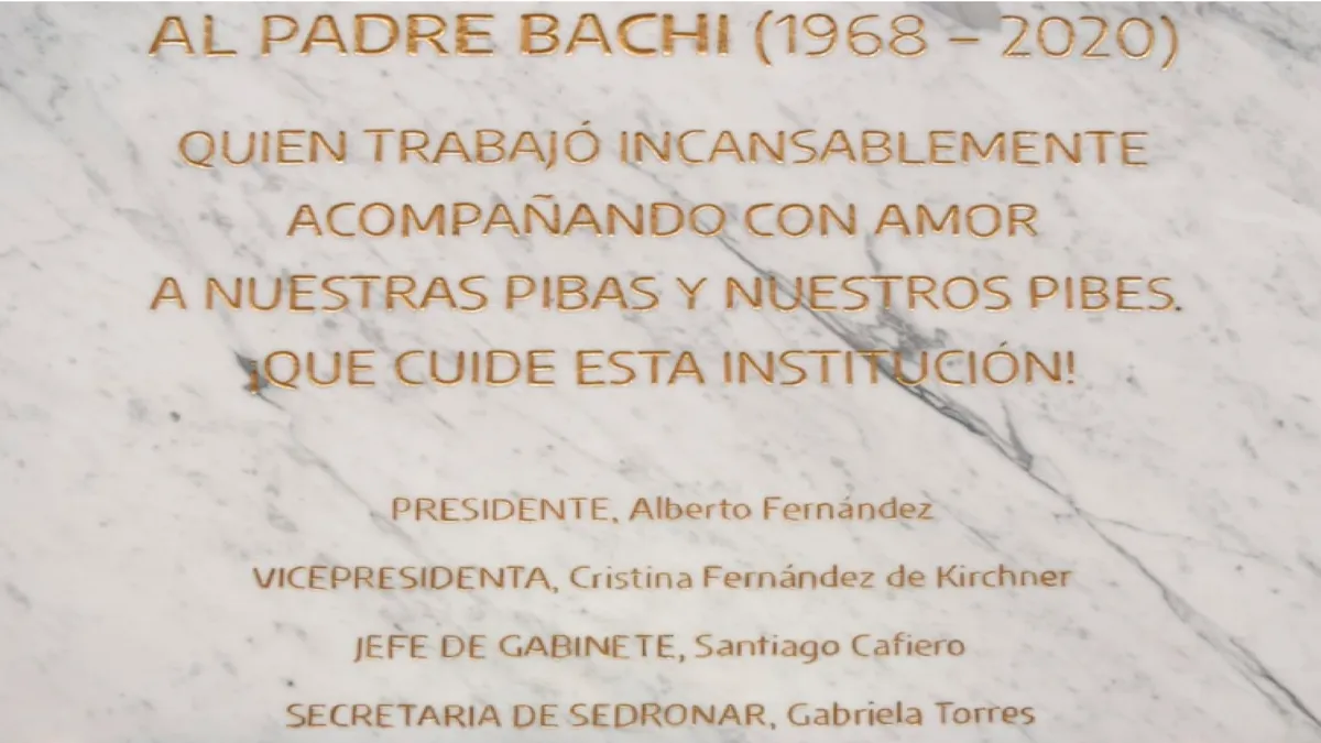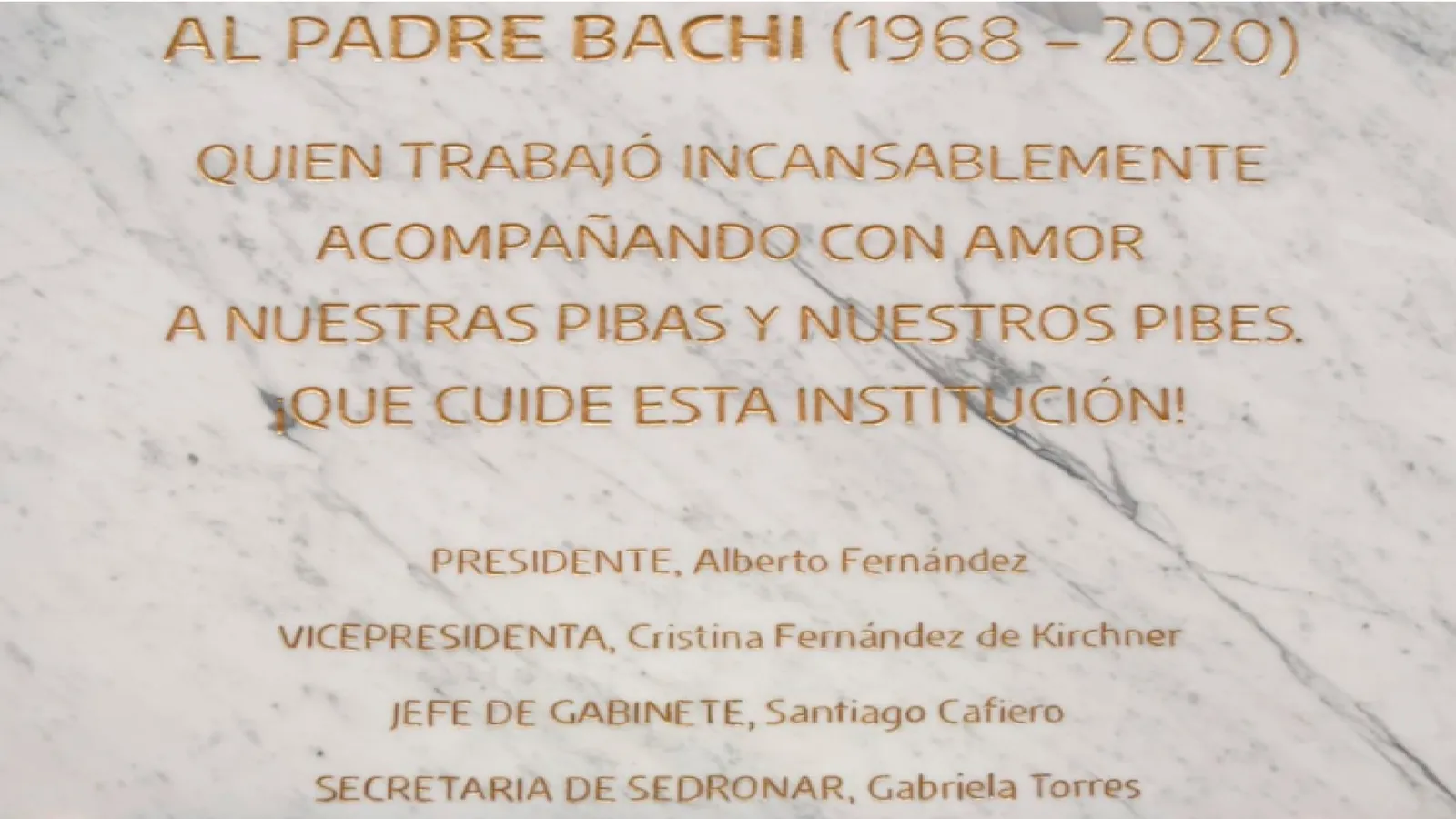 En el ingreso a la Sedronar se descubrió una placa con la siguiente leyenda: "Al Padre Bachi (1968-2020), quien trabajó incansablemente acompañando con amor a nuestras pibas y nuestros pibes. ¡Que cuide esta institución!".
