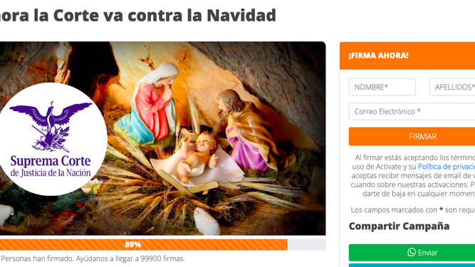 Hasta el momento llevan al rededor de 90 mil firmas y las personas pueden sumarse en este link https://activate.org.mx/activacion/ahora-la-corte-va-contra-la-navidad-635a91b6b9820