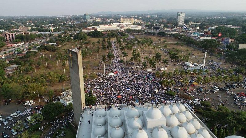 La plazoleta y los predios baldíos en los que se encuentra la Catedral Metropolitana de Managua -en pleno corazón de la capital nicaragüense-, resultaron pequeños para albergar la manifestación. Muchos lograron subir al tejado del templo religioso para ondear banderas azul y blanco y también para poner los nombres de los jóvenes asesinados por la Policía y las turbas para-gubernamentales.