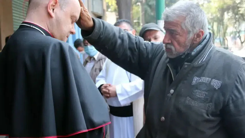 ¿Quién es el obispo? ¿Por qué está recibiendo la bendición de una persona en situación de calle?