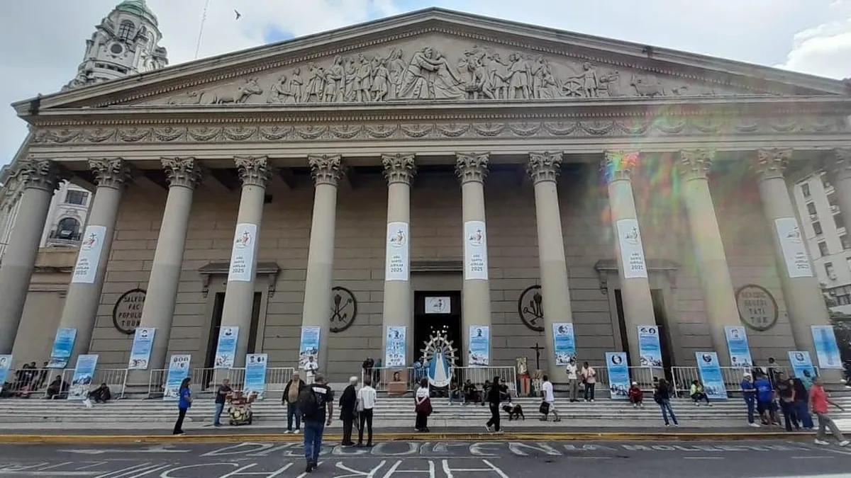 Con una imagen gigante de la Virgen de Luján en el centro, la fachada del Templo mostraba 20 fotos de sacerdotes, religiosas y laicos perseguidos, muchos de ellos torturados, hasta asesinados y desaparecidos.