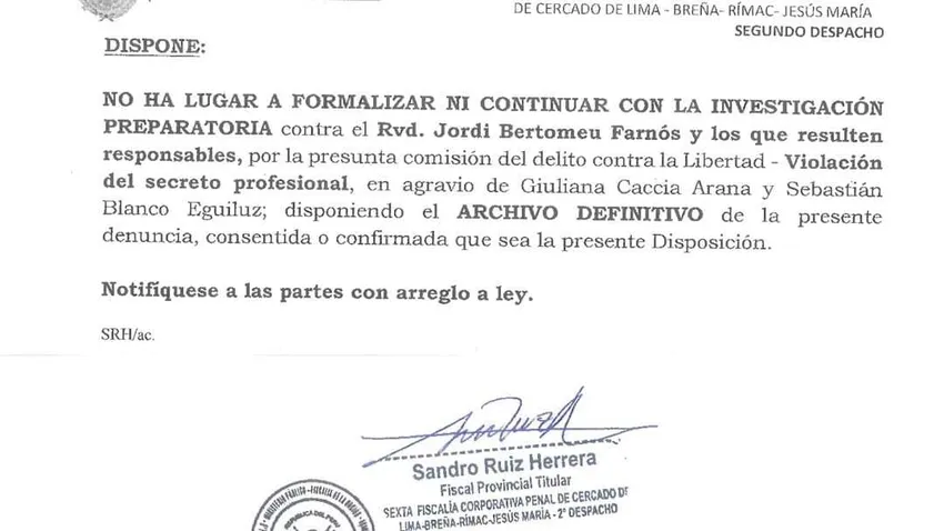 La Fiscalía de Liima ordena el “Archivo definitivo” de la denuncia de los exsodalités Giuliana Caccia Arana y Sebastián Blanco Eguiluz, quienes habían demandado al sacerdote español “por la presunta comisión del delito contra la Libertad -Violación del secreto profesional-