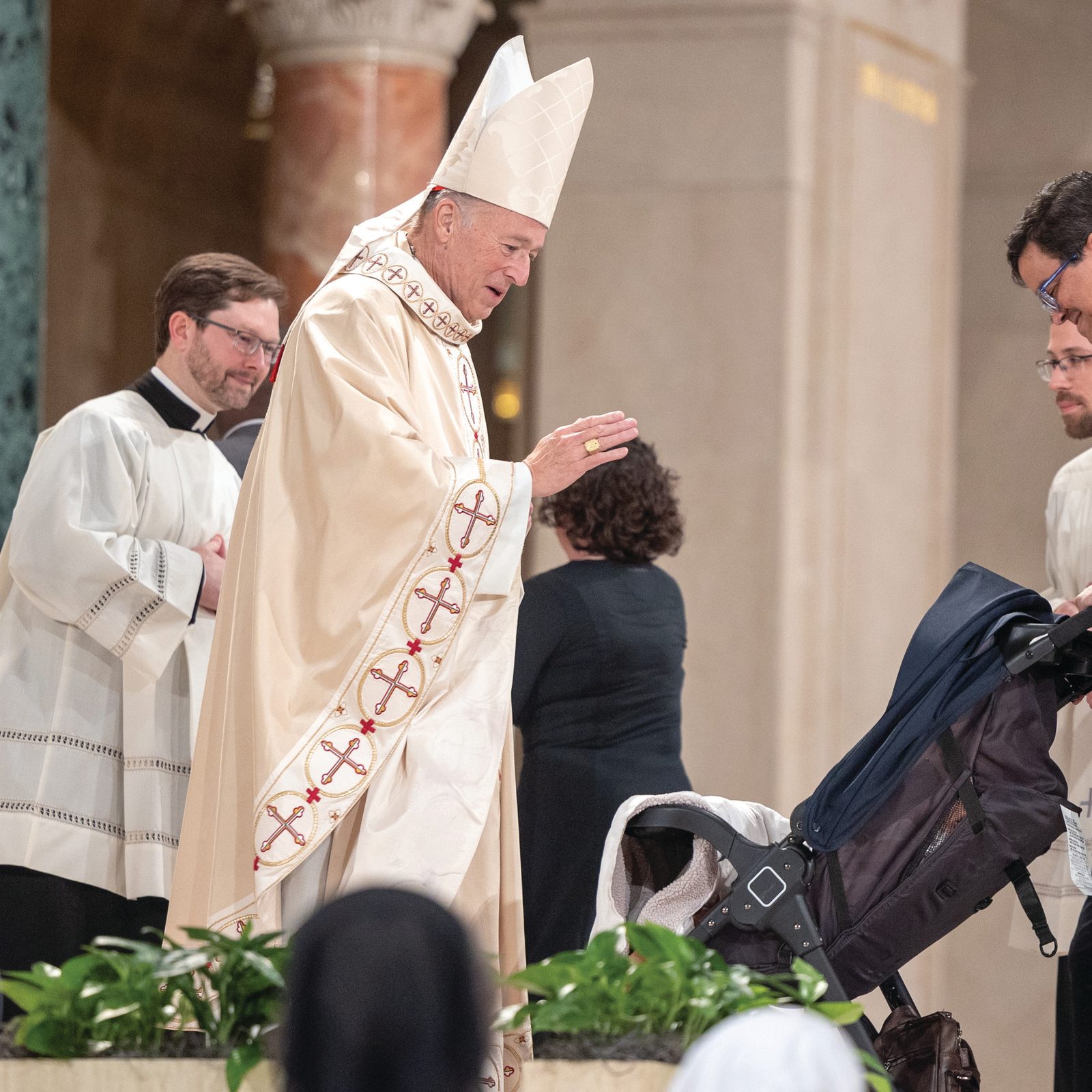 El cardenal Robert McElroy bendice a un bebé mientras saluda a representantes de los ministerios arquidiocesanos y a otras personas en la misa del 11 de marzo de 2025 en la Basílica del Santuario Nacional de la Inmaculada Concepción, en la que fue investido octavo arzobispo de la Arquidiócesis Católica Romana de Washington. (Foto del Catholic Standard por Mihoko Owada)