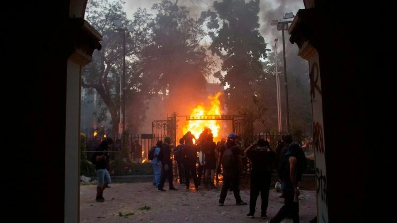 La Iglesia de San Francisco Borja, construida a finales del siglo XIX y asignada a los Carabineros en 1976, fue atacada por un grupo de encapuchados que participaban en una manifestación en la cercana Plaza Baquedano. Los manifestantes sacaron sillas, muebles y biblias que fueron quemadas frente al recinto mientras el interior de la iglesia quedó completamente destruido ya que los vándalos no permitieron la acción de los bomberos para controlar el fuego. Al finalizar la eucaristía, junto al rezo del Ave María se invitó a la comunidad a hacer el gesto de abrir y atravesar las puertas del templo quemado.