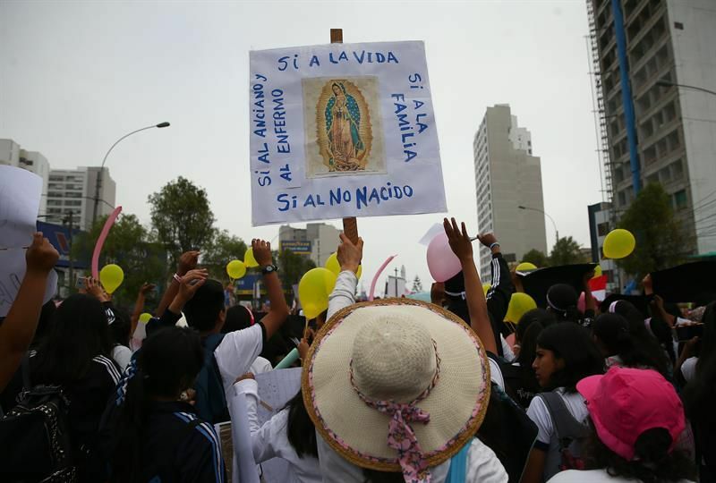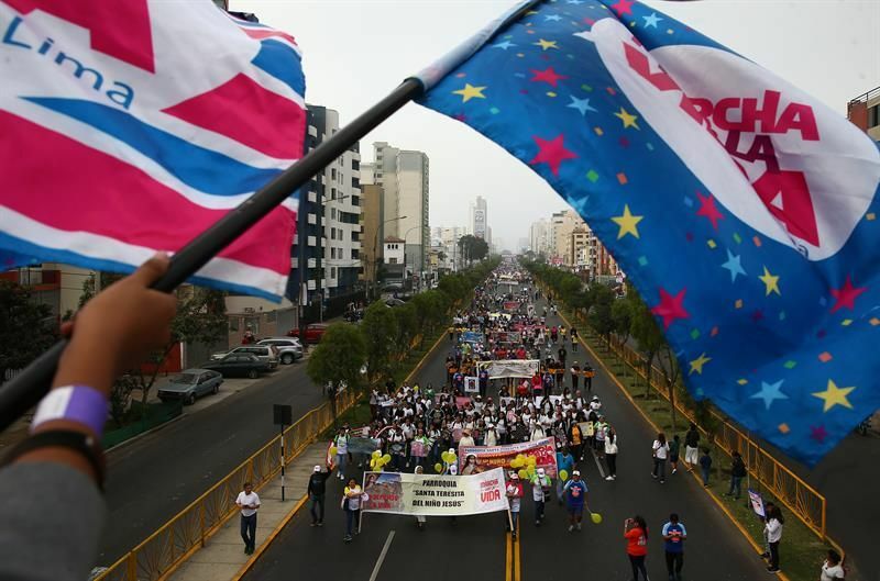 Miles de peruanos marcharon hoy en Lima contra el aborto en una multitudinaria manifestación promovida por la Iglesia católica y colectivos evangélicos en la que participaron el primer ministro, César Villanueva, y el presidente del Congreso, el fujimorista Luis Galarreta.