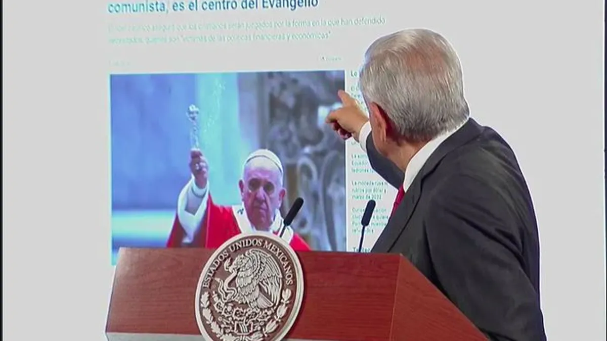 “Si él (papa Francisco) opinara algo en contra de la política de México entonces sí tendríamos que ver qué está pasando, ¿pero que puede opinar en contra el Papa Francisco si en México estamos atendiendo a los pobres como nunca, si se está demostrando de que en México se redujo la pobreza y se redujo la desigualdad como no sucede en otros países del mundo? por eso no hay nada que temer, estamos bien. Y garantizar las libertades a todos porque también tiene que haber discrepancias, no puede haber un pensamiento único. La democracia es pluralidad, es la opinión de todos y es libertad y todos podemos manifestarnos. En México hay libertades plenas y hay libertad religiosa”, dijo.