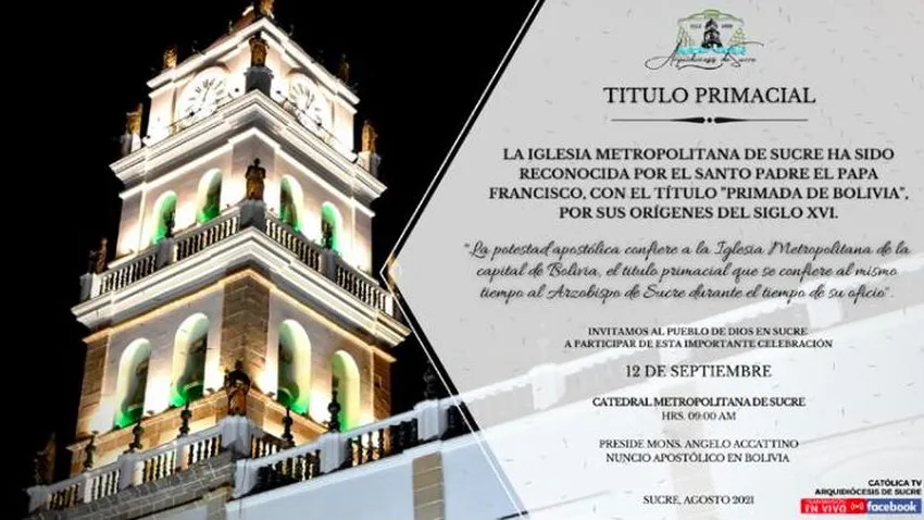 La Iglesia metropolitana de Sucre fue reconocida por el Santo Padre Francisco, con el título “Primada de Bolivia”, por sus orígenes en el Siglo XVI.