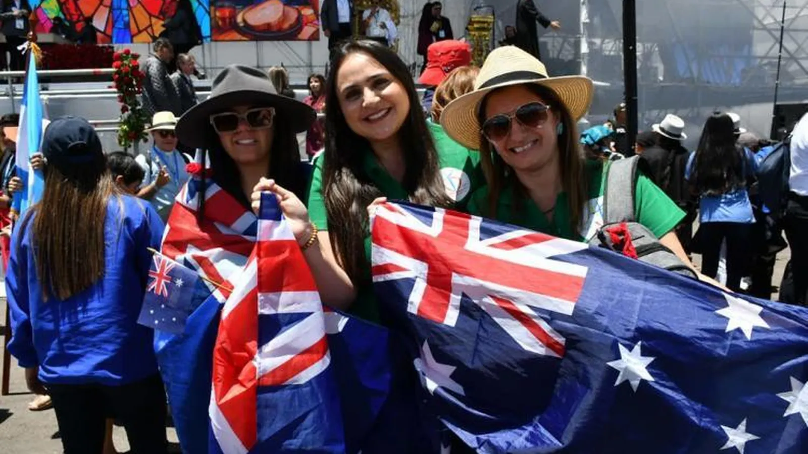 Los miembros de la delegación de australianos presentes en la celebración no pudieron contener su alegría ante el anuncio. Y, al terminar la misa, una parte de esa delegación subió al estrado para presentar su primer mensaje, por medio del cuadro de Paul Newton que muestra un pedazo de historia: la primera comunidad católica de Sidney rezando ante la Eucaristía, a comienzos del siglo XIX, cuando las autoridades inglesas obstaculizaban la celebración de los sacramentos a los pocos sacerdotes católicos presentes en la isla.