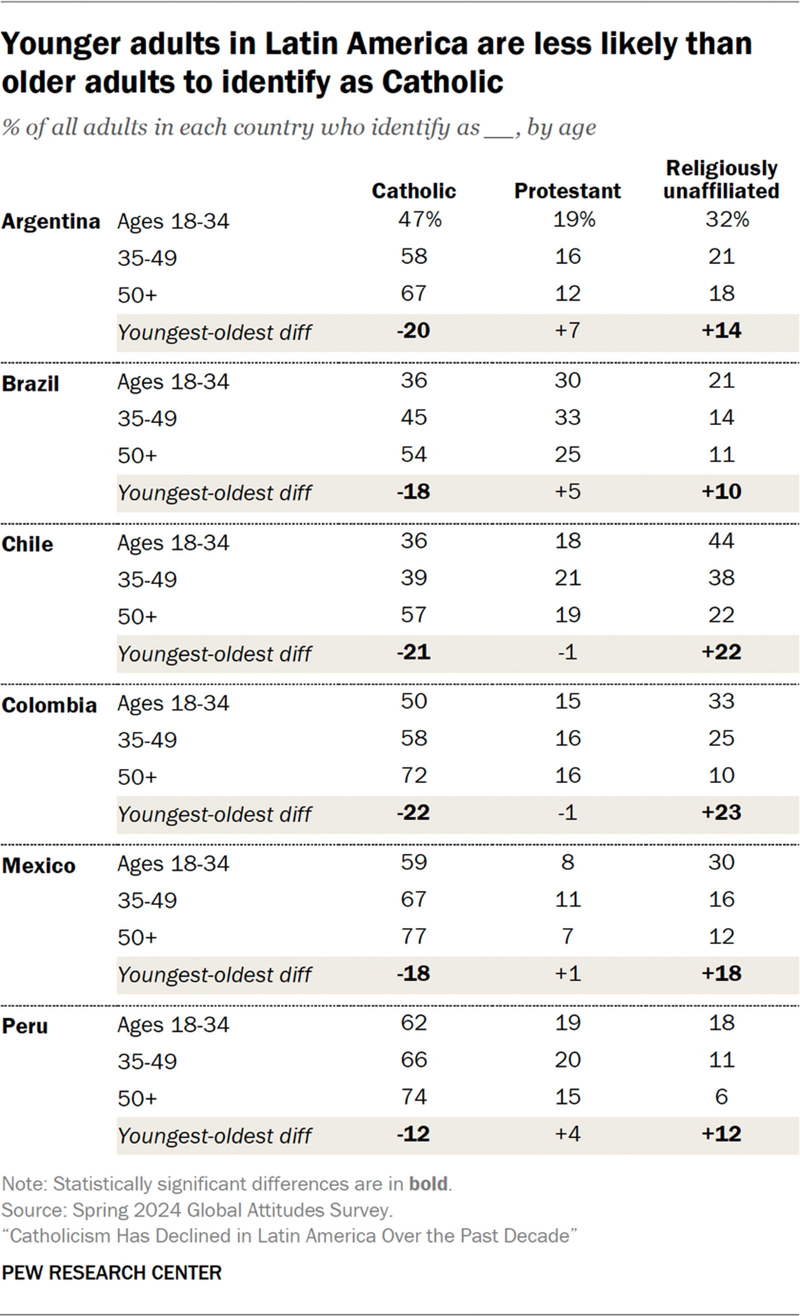 Actualmente, los católicos representan entre el 46 % y 67 % de la población adulta en cada uno de estos países, mientras que el porcentaje de personas religiosamente no afiliadas -que se describen como ateas, agnósticas o "nada en particular"- oscila entre el 12 % y el 33 %.