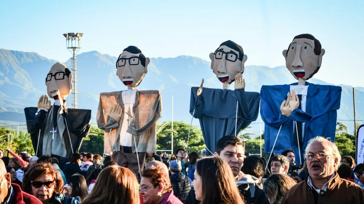 A las 10.46 una gigantografía con las imágenes de monseñor Angelelli y compañeros mártires fue desplegada en el altar, en medio de vítores, la entonación del Himno de los Mártires Riojanos y los aplausos de miles de fieles congregados en el Parque de la Ciudad, de la capital provincial.