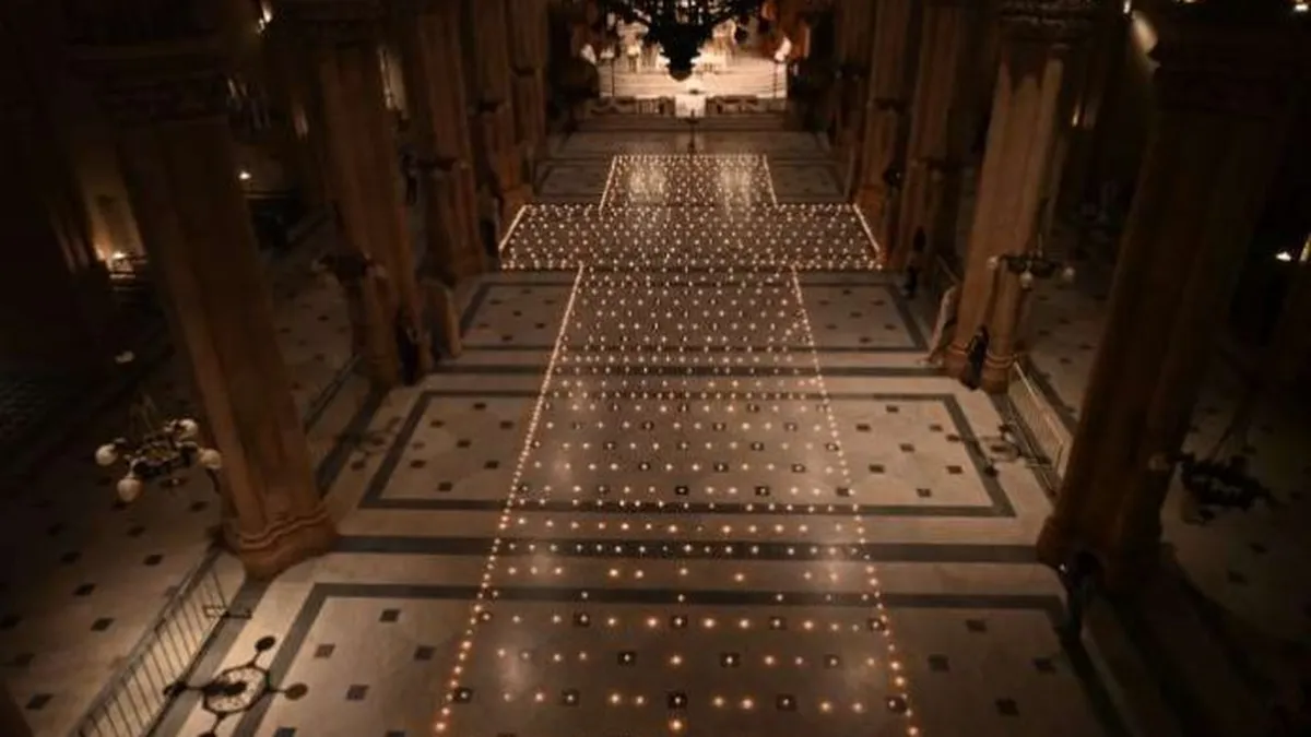Mil velas dispuestas con forma de cruz en la nave central de la basílica de Nuestra Señora de Luján sirvieron para rezar y recordar a los más de 100.000 fallecidos por Covid-19 en la Argentina.