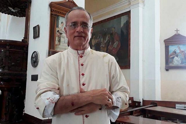 El obispo auxiliar de Managua, Silvio José Báez, muestra las heridas que sufrió en el ataque en Diriamba