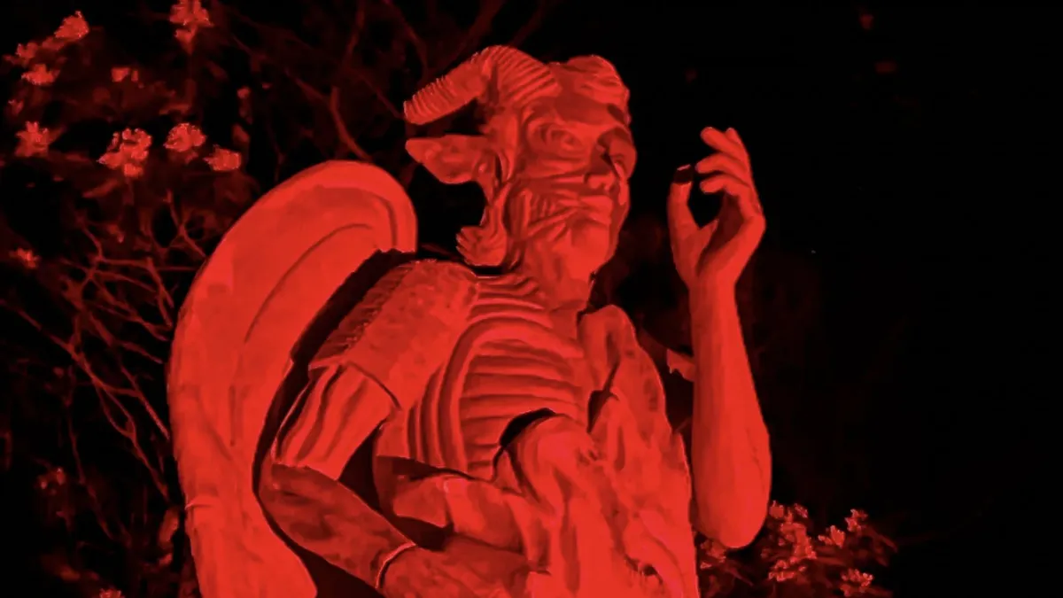 Con una enorme estatua del demonio alado de cinco metros de altura