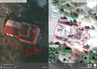 Imágenes satelitales con el antes y después del teatro de Mariupol, en la base de datos reunida por Unesco y Unosat.AP.