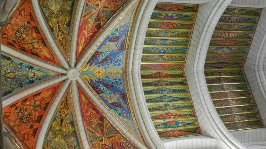 En vez de convertir el techo en un trampantojo (como los que imitan el cielo) o darle oscuridad solemne para el recogimiento, el pintor transformó los tramos entre los nervios neogóticos en un estampado alegre, que parece encarnar la fusión del color y la geometría en la naturaleza