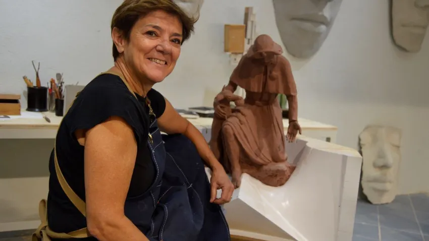El silencio del taller de Béatrice Bizot, en el corazón de la Part Baixa de Tarragona, es casi palpable. Las herramientas descansan sobre la mesa como si esperaran nuevas órdenes, mientras una maqueta de San Roque parece observar con una serenidad antigua. No es la pieza definitiva —esa ya ha sido trasladada al taller de Granits Barbany, en Llinars del Vallès, para ser esculpida en piedra—, pero conserva el latido original del gesto, la intención primera de la artista.