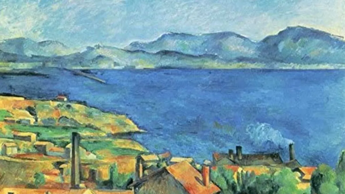 Cézanne pintó las casas de la localidad integradas en la naturaleza de una manera que parece inofensiva y que le deja el protagonismo a todos sus elementos: el cielo, las colinas, la costa. Y un aire que también parece percibirse. El color, por su parte, se entiende sin discusiones con el dibujo, y el contraste de los naranjas y azules vibra.