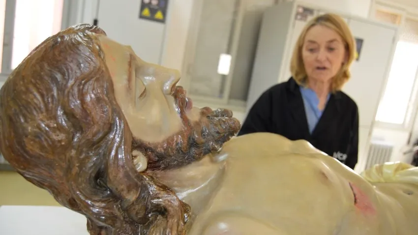 Una de las piezas más emblemáticas que reposa en este espacio silencioso y blanco es un Cristo yacente, una talla de madera policromada de la iglesia de San Jorge Mártir. Esta figura, medio cubierta de barro, se convirtió en una imagen viral en medio del caos y fue bautizada popularmente, según la valenciana, como “Cristo del barro”. Ahora, con la mirada baja y la carne aún pálida, presenta pérdidas de estrato pictórico y algunos dedos mutilados. El barro, pese a la limpieza meticulosa, persiste en las grietas. “Este taller es como un hospital, hay pacientes que aceptan bien los tratamientos y otros que no”, reflexiona la restauradora.