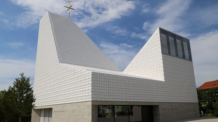 Cubierta toda su fachada con 15.000 azulejos tridimensionales blancos, que permiten que el edificio brille al sol, como si se tratase de una montaña nevada, al templo lo llaman popularmente "el salto de esquí de Dios". Coronado por una cruz dorada con veleta, a 34 metros de altura, el edificio ya ha sido galardonado con otros premios (nacionales) por su especial diseño. El cardenal Reinhard Marx, arzobispo de Munich, lo consagró en junio de 2018.