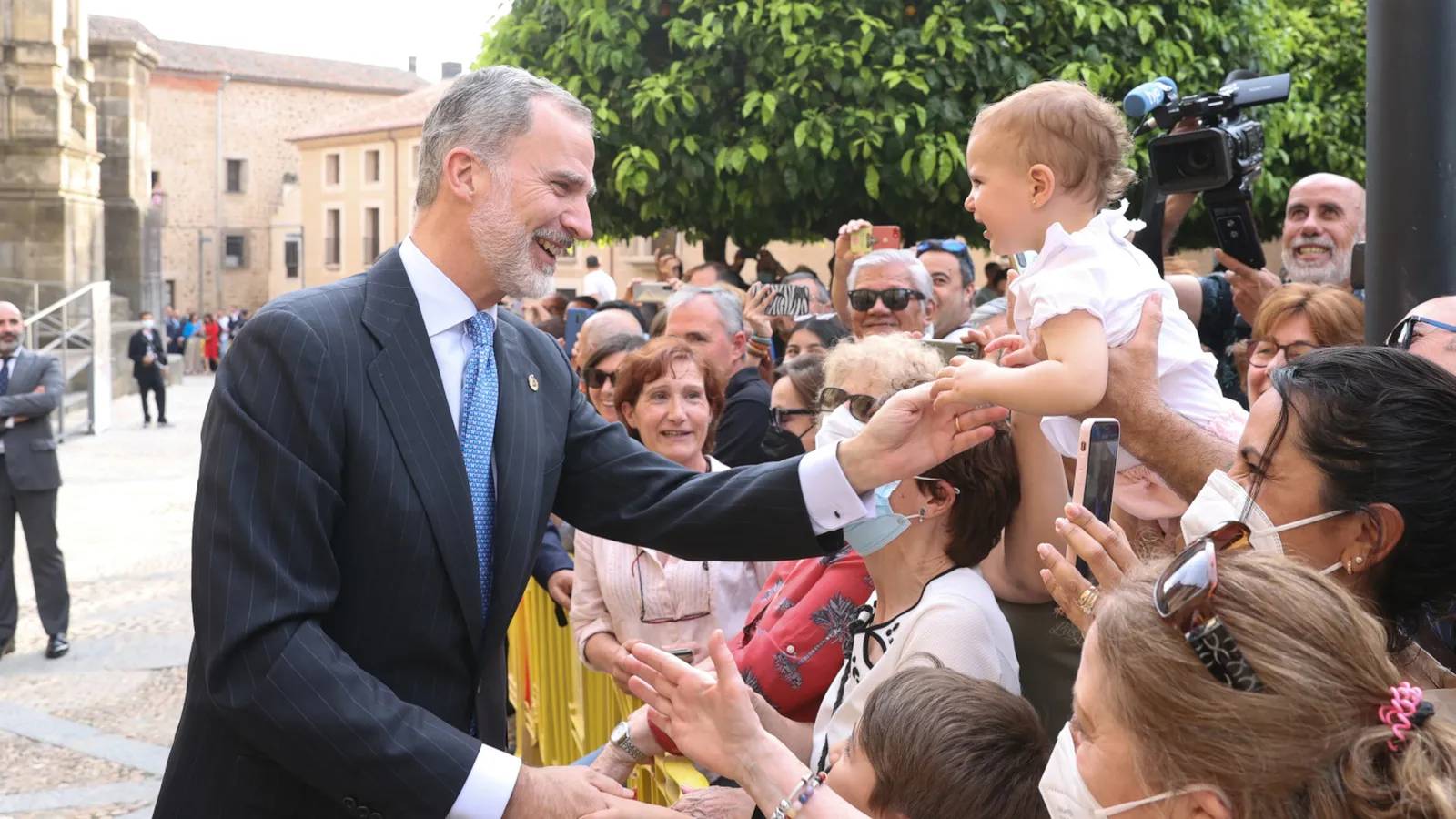 Cientos de personas esperaban en las afueras de la Catedral de Plasencia al Rey Felipe VI, quien a su llegada se ha acercado a saludar e incluso firmar autógrafos a algunos de ellos.