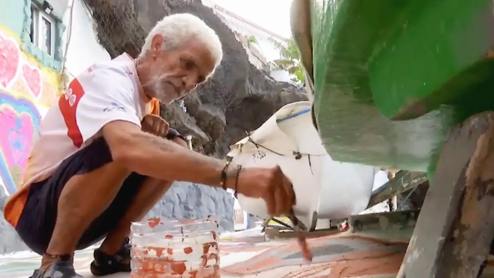 Es pequeño y delgado, pero fuerte. Su piel, morena. Sus ojos, grisverdeazulados, chispean. Castigado por la vida en el mar, no es fácil averiguar su edad. Se diría que entre sesenta y setenta. Ya no sale a pescar y ha jubilado su barca. Si no es con él, ella no se mueve; ahora está en tierra, decorada con vivos colores, alegrando el lugar. Descansando en sueños de agua salada.