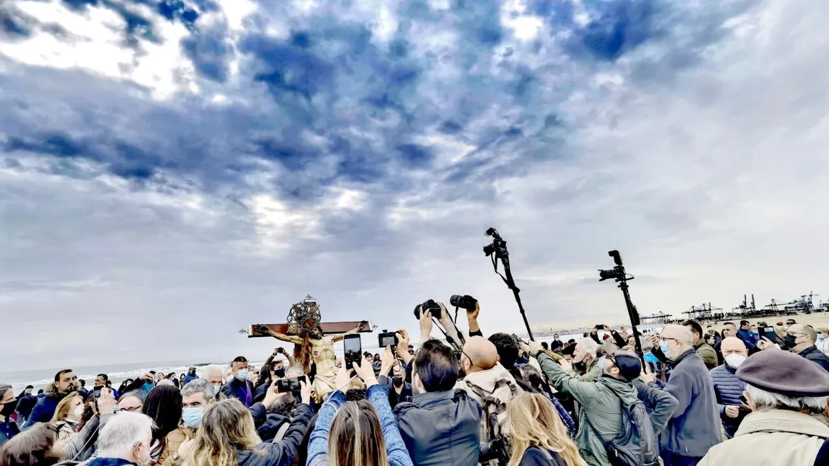 Tanto impresiona y atrae este Cristo que se ha convertido, sin pretenderlo, en un Cristo mediático, siempre rodeado de cámaras y flashes cuando se asoma por las calles. Y en la playa, en su mar, en el mar de su gente, la atracción mediática se acrecienta y dispara. Las cámaras lo quieren, se deshacen en disparos por retener su imagen, de mirada preciosa y serena, a pesar del dolor de la cruz, los clavos y la corona de espinas. Es el gran Cristo de la Semana Santa Marinera. Y de Valencia, que sigue sin Semana Santa a lo grande como en cualquier otra ciudad española y le salva esta carencia la Marinera. Al expulsar a pescadores y marineros para acometer las grandes reformas urbanísticas, expulsaron también su Cristología, su Semana Santa propia, la manera de entender y poner a su altura los marineros a Cristo.