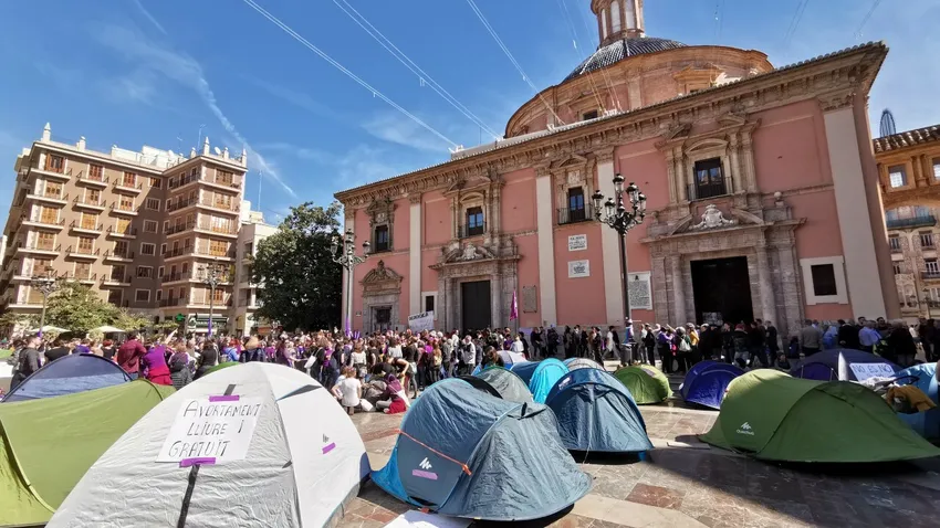 Colectivos de feministas realizaron diversas acciones con motivo del 8 M, principalmente en la plaza de la Virgen de Valencia, donde levantaron tiendas de campaña que la ocuparon a lo largo del día, hasta media tarde en que comenzó la manifestación.En la fachada de la Real Basílica de la Virgen de los Desamparados colocaron carteles y una mesa de información, repartiéndose octavillas reivindicativas.