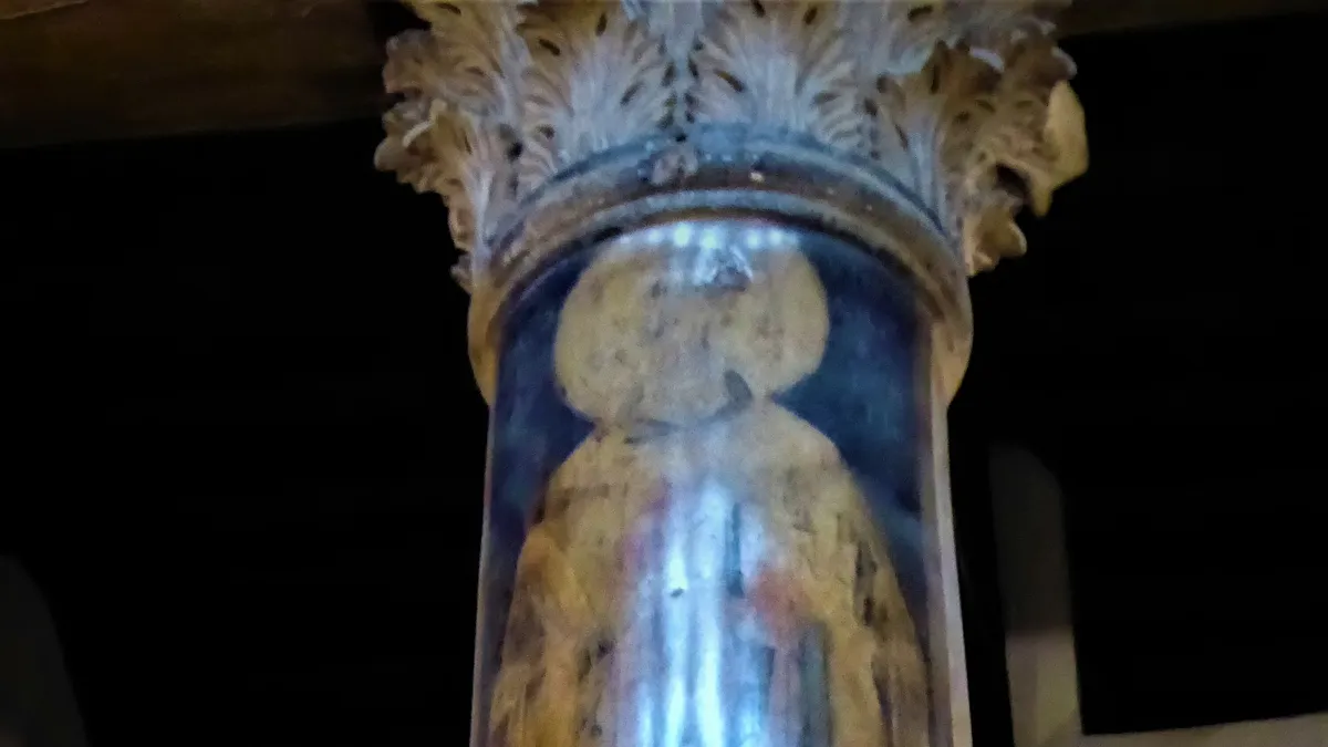 Las pinturas de las columnas han sido restauradas y limpiadas del hollín de las velas y el polvo del tiempo, que las ennegreció. Una tradición oral que se conserva es entre 1127 y finales del siglo XII, ricos peregrinos pagaron a artistas para que representaran a los santos de su familia o de su región en la iglesia. No cabe pues descartar que alguien de tierras valencianas ideara y pagara la pintura de san Vicente mártir. El restaurador ahora ha sido el italiano Marcello Piacenti. “Ahora, se ven perfectamente las siluetas sobre las columnas rosadas. Solo faltan los rostros, borrados por los musulmanes tras la conquista islámica siguiendo la prohibición de su religión de representar la forma humana.”