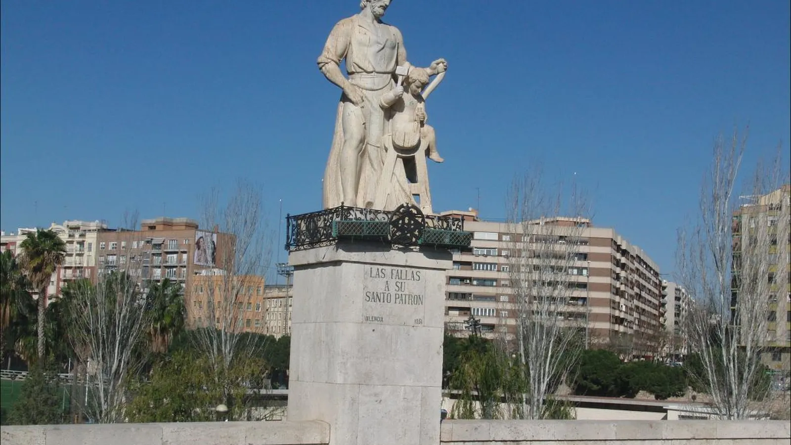 Hoy tenemos al santo en el puente de su nombre, que en origen no se llamaba así, sino Nuevo, era de madera y servía para conectar en tiempos musulmanes con las tierras que rodeaban el palacio moro de la Zaydía. El actual, de cantería, es de 1606. Tiene 13 arcos. Antaño había dos imágenes, una de santo Tomás de Villanueva y la otra de san Luís Bertrán, esculpidas en piedra blanca por el afamado escultor italiano Ponzanelli. Estas fueron retiradas al Museo de Bellas Artes al ser ensanchado el puente y en los años 40 instaladas en el puente de la Trinidad. Hoy, figura una estatua de san José colocada en 1951, encargada por Junta Central Fallera al escultor Octavio Vicent. Ante este monumento las Falleras Mayores de Valencia hacen una ofrenda floral en las mañanas del día de san José. No ha tenido nunca suerte san José en su iconografía, pues lo pintan y esculpen siempre casi un anciano, cuando en tiempos de Jesús Niño era joven. Lo mismo le pasa a la Virgen, que siempre la interpretan una señora mayor, cuando en dicho tiempo era muy joven.