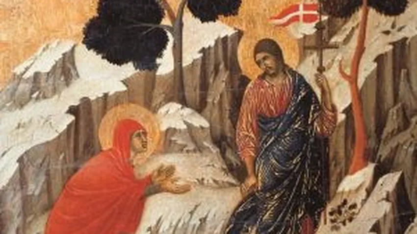Juan describe, un poco más tarde, a María corriendo de una parte a otra para buscar alguna información. Pero cuando ve a Jesús, cegada por el dolor y las lágrimas, no logra reconocerlo. Piensa que es el encargado del huerto. Jesús solo le hace una pregunta: «Mujer, ¿por qué lloras? ¿a quién buscas?».