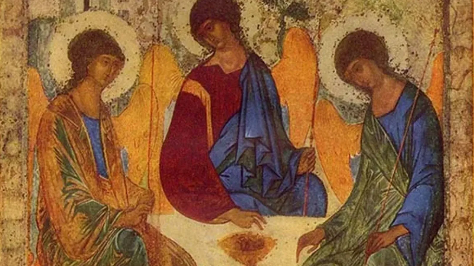 El conocido icono de la Trinidad de Andrei Rublev (s. XV), donde vemos a tres jóvenes sentados dialogando en torno a una mesa, nos puede ayudar a acercarnos a este misterio. Son tres personajes de rostros parecidos, porque todos son Dios, pero cada uno tiene un traje de color diferente (dorado, rojo y verde), porque representan a las tres personas divinas. El Padre que lo da todo al Hijo, el Hijo que lo recibe todo del Padre con agradecimiento y el Espíritu que es el fruto del amor entre el Padre y el Hijo. Esta imagen se inspira en tres personajes que aparecen en el libro del Génesis (v. Gn 18,1-15), son tres enviados de Dios acogidos por Abraham, que entran en relación con él. Abraham les invita a sentarse y a compartir juntos la mesa, mientras Sara les escucha en el interior de la tienda. Es una relación de cariño y de fraternidad como la que Dios Trinidad quiere que tengamos con Él y entre nosotros.