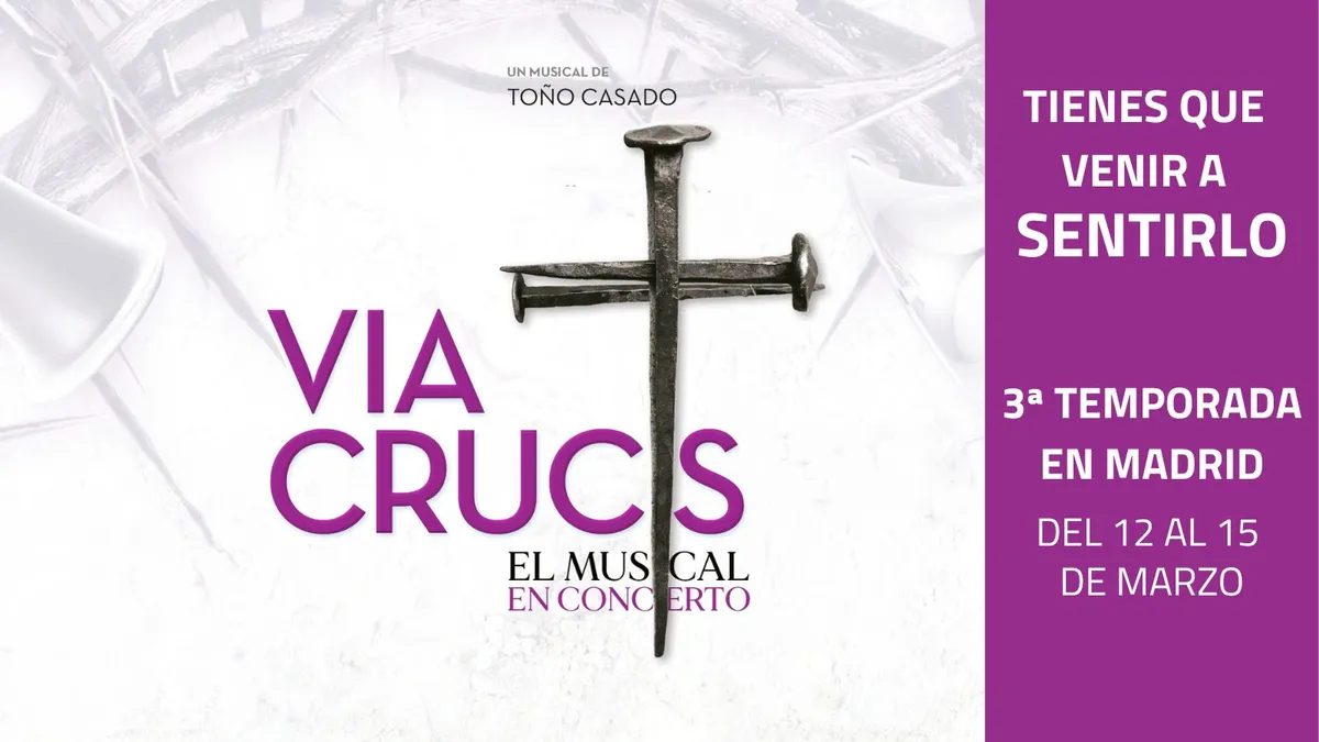 'Via crucis. El musical' es un emocionante espectáculo de arte y de fe que narra las últimas horas de la vida de Jesús, su Pasión y su muerte. Avalado por más de 25.000 espectadoras en Córdoba, Valladolid, Zaragoza y Alba de Tormes, regresa a Madrid en su tercera temporada y el próximo mayo estará en Santander.