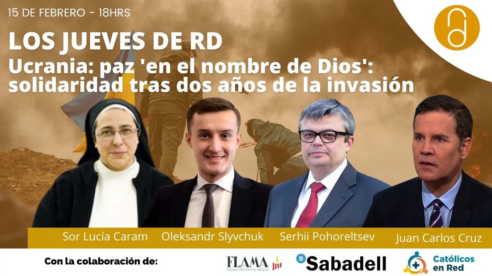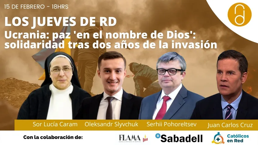 Este jueves, 15 de febrero, los Jueves de RD tendrán como protagonista la guerra de Ucrania, y la lucha por la solidaridad en el país. 'Ucrania: paz 'en el nombre de Dios': solidaridad tras dos años de la invasión' será el lema del debate de esta semana, que como siempre está patrocinado por Instituciones Religiosas del Banco Sabadell, con el apoyo técnico de Católicos en Red y la colaboración de la Agencia Flama. Con un panel de lujo, y alguna sorpresa
