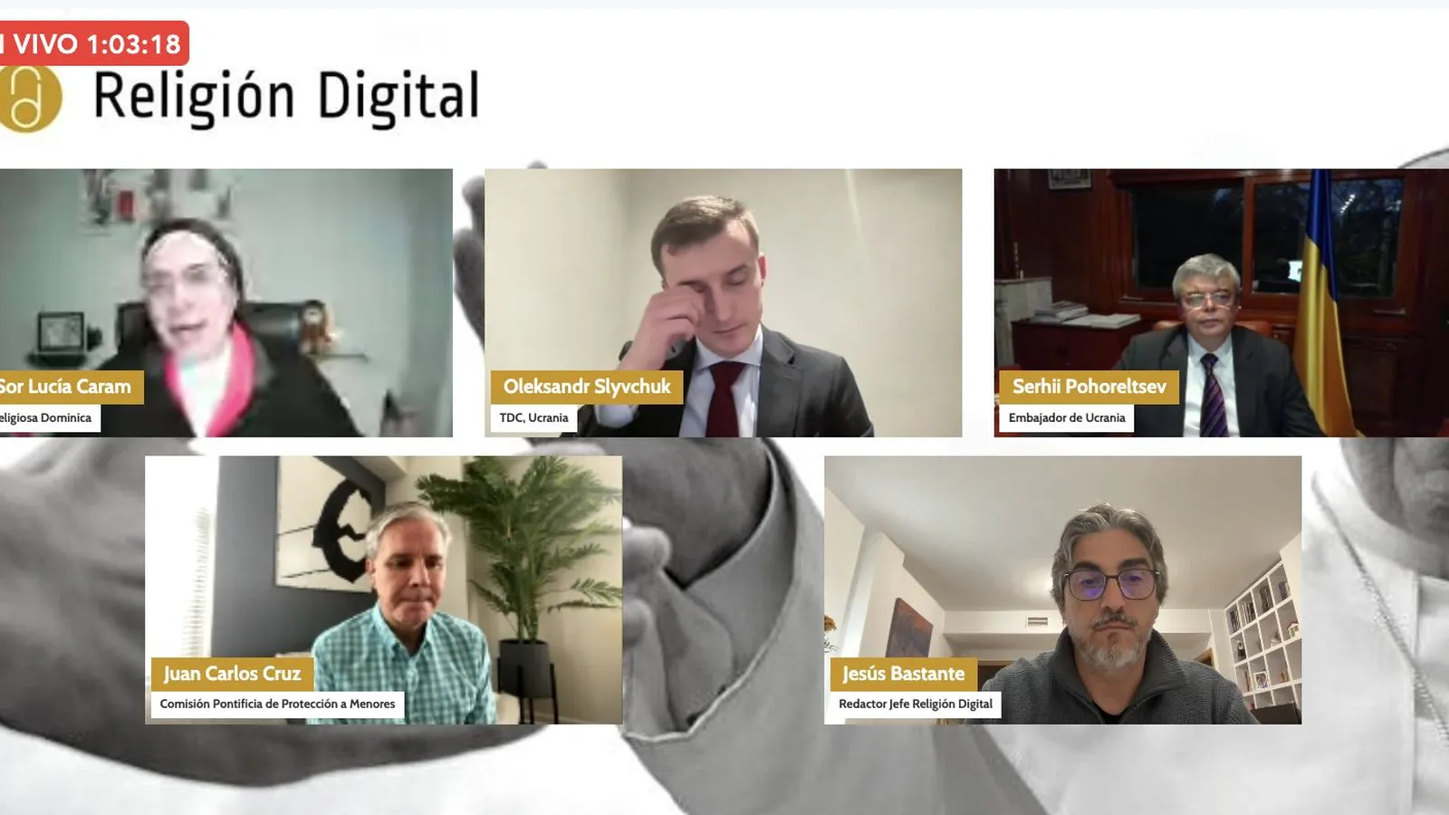 Así ha recordado sor Lucía Caram cómo vivió los primeros días de un conflicto sangriento de cuyo inicio se cumplirán dos años el próximo 24 de febrero. Lo ha hecho en una nueva edición de 'Los Jueves de RD' que ha tenido Ucrania como protagonista y ha contado con las voces de Jesús Bastante, redactor jefe de Religión Digital y moderador, Serhii Pohoreltsev, embajador de Ucrania en España, Juan Carlos Cruz, miembro de la Comisión Pontificia de Protección a Menores, y Oleksandr Slyvchuk, coordinador de Programa de Cooperación para España y Latinoamérica del Centro de Diálogo Trasatlántico desde Ucrania.