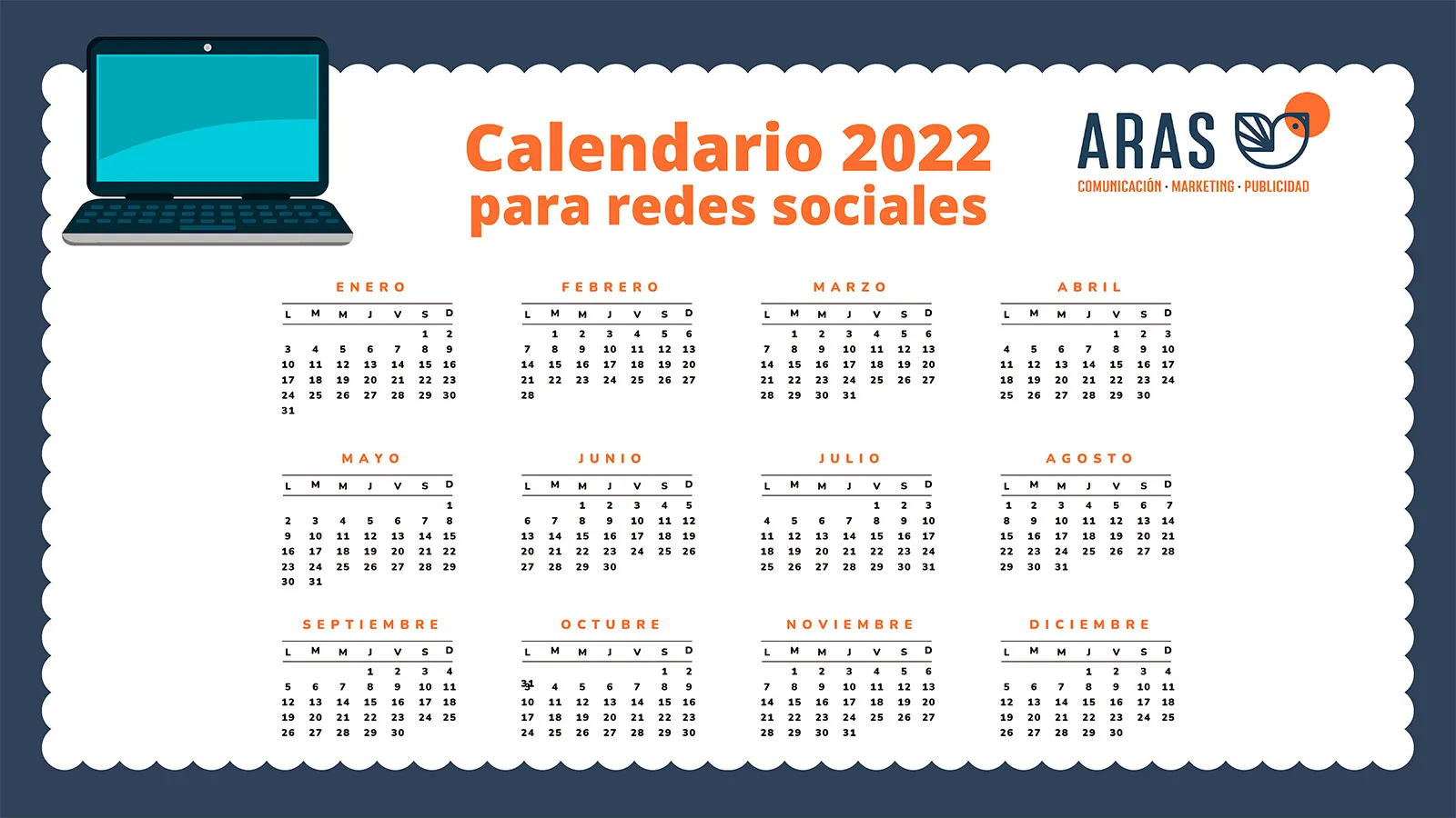 El calendario 2022 de ARAS contiene los tiempos litúrgicos, fiestas cristianas y celebraciones destacadas; santoral, incluidos fundadores de institutos y órdenes religiosas; jornadas de la Iglesia (tanto pontificias como de la Conferencia Episcopal Española); aniversarios relacionados con los últimos papas (cumpleaños, inicio del ministerio, etc.), aniversarios de los documentos del papa Francisco y eventos eclesiales que van a ser noticia en 2022.