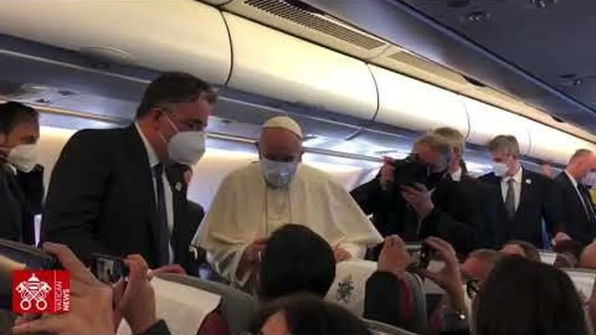 En la recorrida que hizo Francisco para saludar a los 74 periodistas que lo acompañaron a bordo del avión papal, el Papa aprovechó para intercambiar saludos y deseos. Con riguroso barbijo para recorrer el Airbus A330 que Alitalia bautizó "Giotto" en homenaje al pintor florentino, el Papa se llevó también varios regalos de parte de la delegación de periodistas que representaron a 15 países. Uno de los que más los sorprendió fue una caja diseñada especialmente con un documental sobre Astor Piazzolla, producido por la Sociedad Italia-Argentina de Roma, a días de que el próximo 11 se cumplan los 100 años del nacimiento del bandoneonista y compositor.