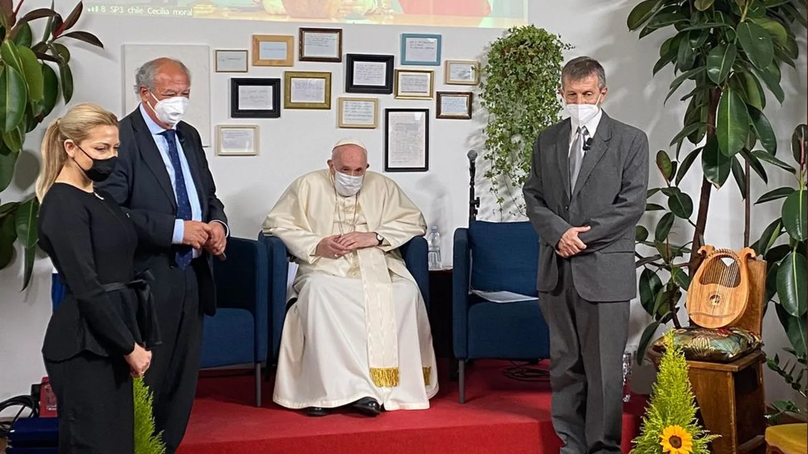 Al llegar al edificio con barbijo, algo inusual en sus salidas del Vaticano, el Papa había dedicado los primeros 20 minutos de su estadía en la sede que ocupa el tercer piso del Palacio San Calisto a saludar a jóvenes latinoamericanos e italianos que participaron de distintos programas de la fundación.