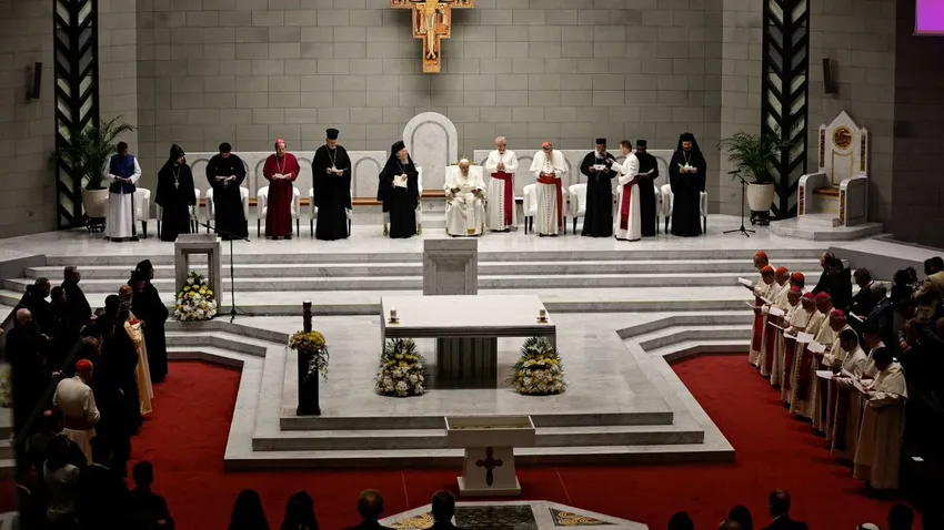 Además de sus encuentros con exponentes islámicos, el Papa encabezó hoy un encuentro ecuménico y oración por la paz en la flamante catedral Nuestra Señora de Arabia, inaugurada en diciembre de 2021, la más grande de las dos Iglesias del país.
