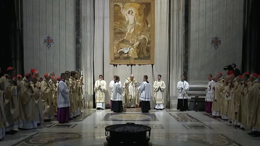 Este sábado, como es costumbre desde 2022 por los problemas en su rodilla derecha, el Papa entró en la Basílica en silla de ruedas, mientras dentro unos 6.000 fieles contemplaban en oscuras el tápiz expuesto de "La resurrección", hecho en 1783-1784 con hilo de plata dorado sobre la pintura de Anthony van Dyck.