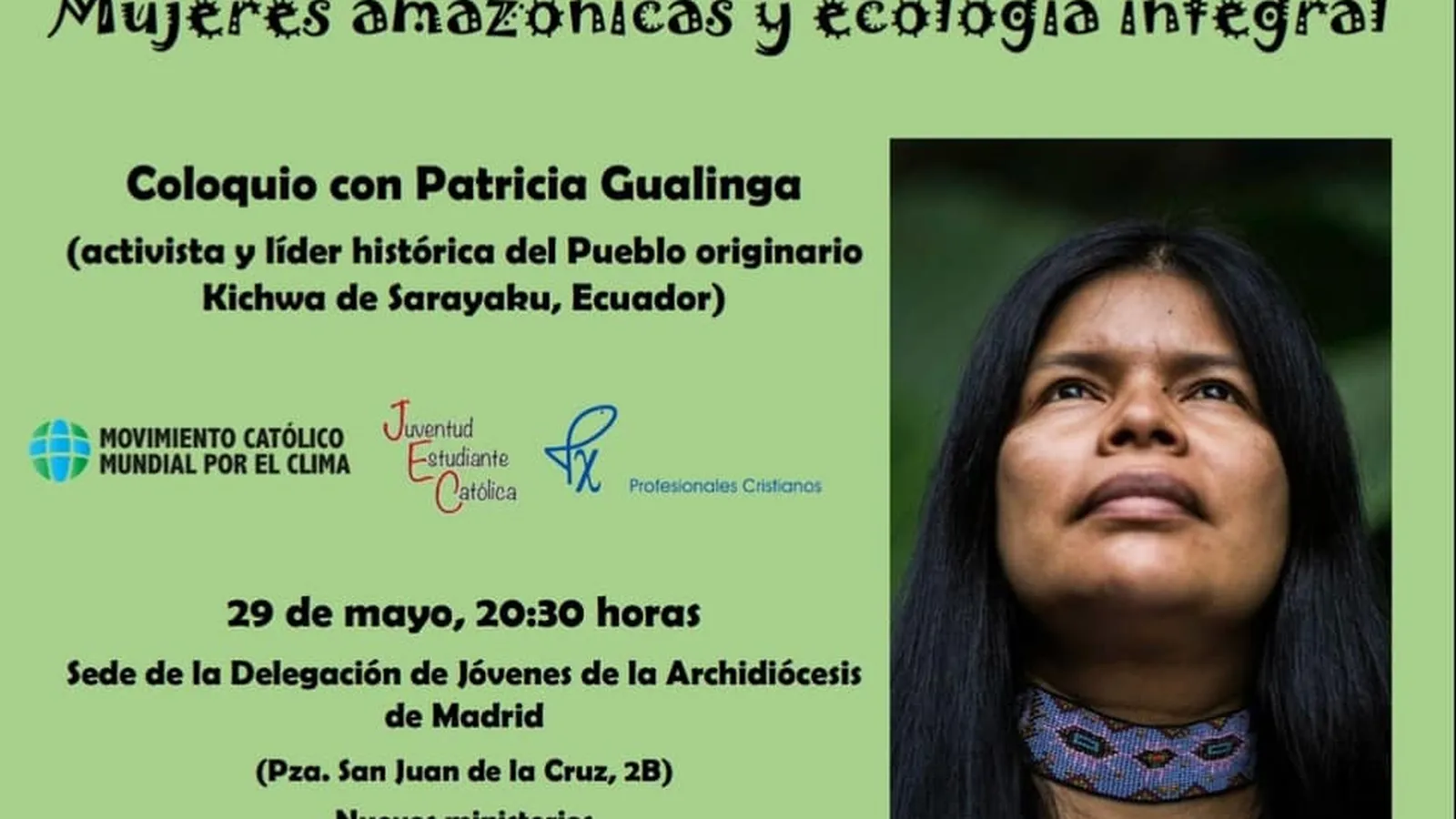 En camino hacia el Sínodo Panamazónico, la *Juventud Estudiante Católica (JEC)* , *Profesionales Cristianos (Px)* y *Movimiento Católico Mundial por el Clima (MCMC)* os invitamos a compartir un espacio junto a Patricia Gualinga, activista ecuatoriana que lleva más de 20 años dedicada a la resistencia contra la explotación petrolera en el territorio de Sarayaku, en el centro de la Amazonía ecuatoriana.