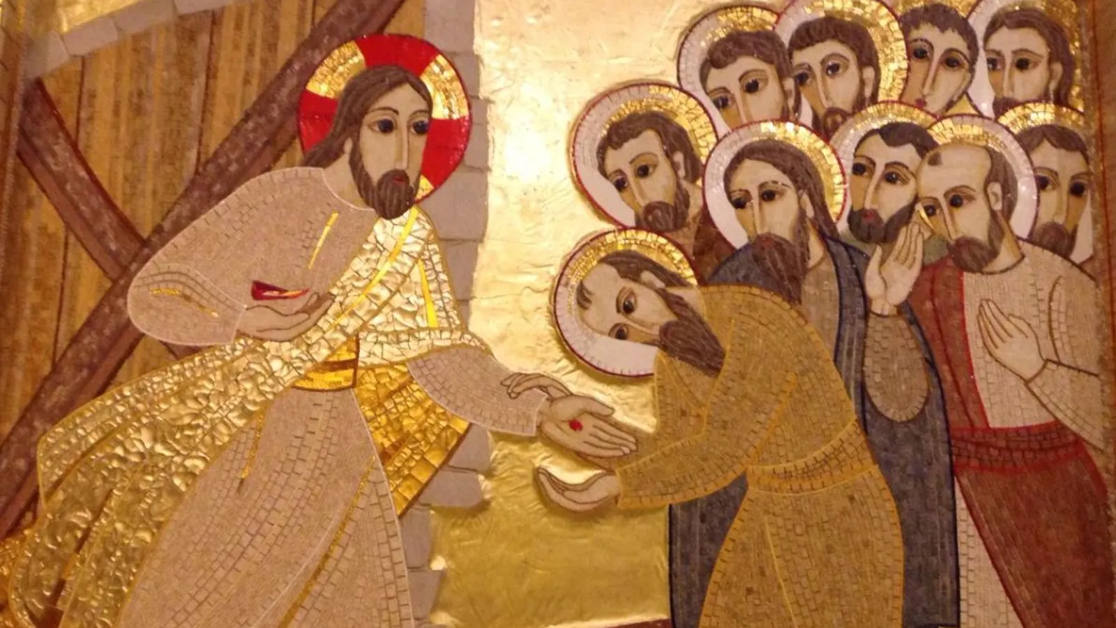 Una cosa queda clara en el texto de arriba: Jesús se presenta a sus discípulos cuando estos, en medio de un ambiente hostil, se encuentran encerrados por miedo a los judíos. Y llega a ellos de noche, como cuando Dios sacó a los israelitas de la opresión de Egipto (Éx 12,42; Dt 16,1). Y en ese momento, les quita el miedo que intranquiliza y les infunde paz, mostrándole los signos de su amor y de su victoria sobre la muerte: sus manos y su costado herido. El que está vivo delante de ellos es el mismo que murió en la cruz. Con imágenes de la Biblia, Jesús se les muestra como el Cordero de Dios, el de la Pascua definitiva, que ha pasado ya de la muerte a la vida.