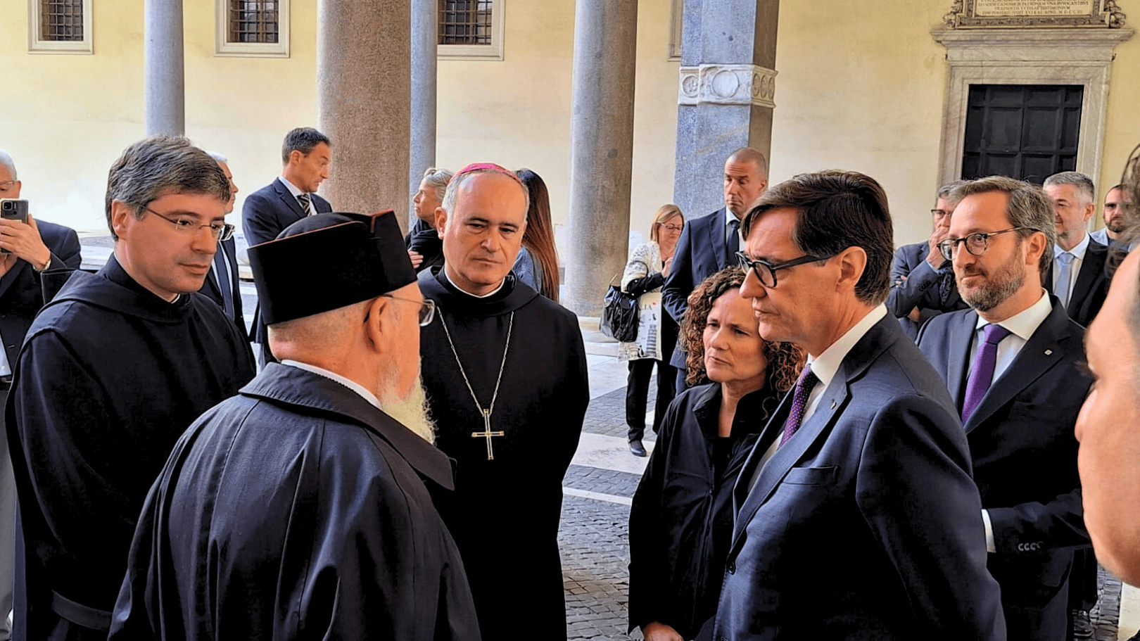 El presidente catalán, durante la inauguración de la exposición de la abadía en el Vaticano Illa insta a asumir los valores benedictinos de Montserrat en Roma para detener el "genocidio de Gaza"