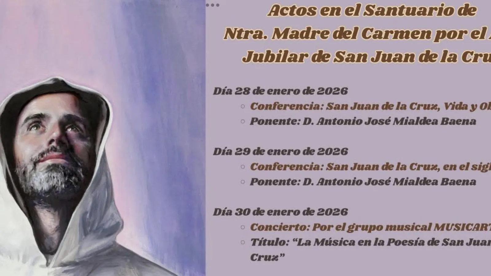 El primero en tomar la palabra será el Dr. Antonio J. Mialdea, reconocido especialista en el fraile carmelita descalzo, que disertará el día 28 de este mes sobre la vida y la obra de San Juan de la Cruz y el día 29 sobre las posibles aportaciones de sus escritos y de su mensaje para nuestro siglo XXI. Le seguirán en día sucesivos otras conferencias y conciertos de gran interés.