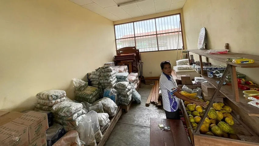 Bellas teorías, pero vamos a la realidad. Ahora estamos en el internado de Islandia, río Yavarí, sacando fotos de los víveres de los que disponen gracias a Qali Warma: arroz, alverjas, conservas de atún y de pavo, fideos, avena, algún frejol… Lo mismo que una familia lleva a la casa por su hijo colegial, lo recibe el internado por cada uno de sus alumnos. Es decir, nada de productos frescos: nada de huevos, pollo, verduras, carne de res, pescado, fruta… Se tienen que apañar solo con alimentos envasados y secos.