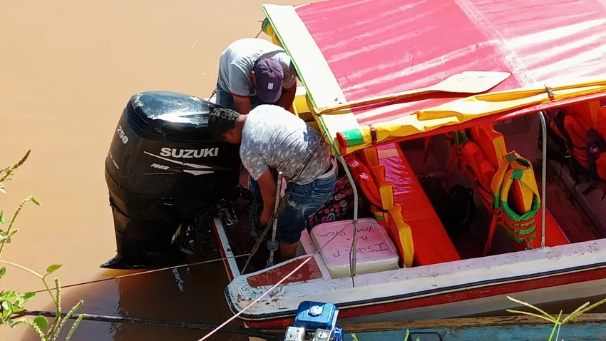 Durante casi tres horas se pelearon con la cola del motor, que desarmaron con ayuda de una llave que prestaron a los del puesto militar cercano. Por fortuna mi chip Claro procesaba SMS a pesar de estar en el extranjero, y pude enviar SOS a Estrecho. Estábamos ya bromeando sobre si íbamos a pernoctar amontonados como anchovetas, con qué nos protegeríamos de los zancudos, etc. en lo que llega una señora del lugar con dos niñas pequeñas y me pregunta: ”¿Es usted el padre César Caro?”